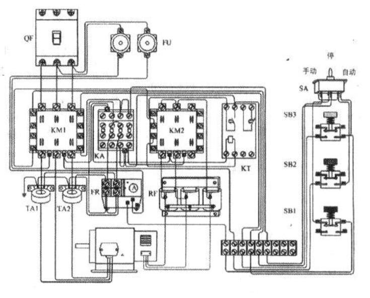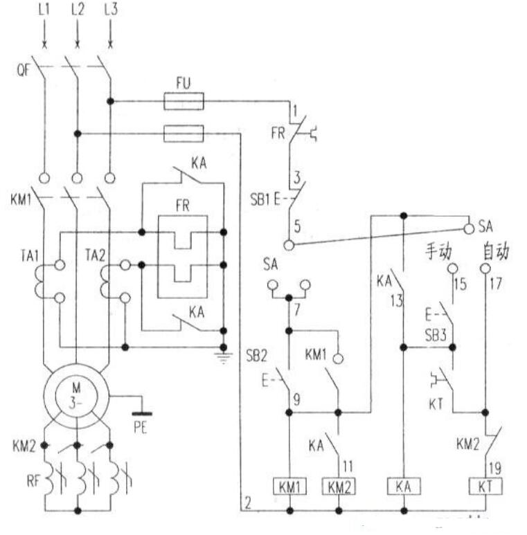 2.手動(dòng)控制。(l)合上空氣開關(guān)QF接通三桐電源。(2)將SA搬至手動(dòng)位置。(3)按下啟動(dòng)按鈕SB2.接觸器KM1線圈得電,吸合并自鎖,主觸頭閉合電動(dòng)機(jī)帶頻敏變阻器啟動(dòng)。(4)待轉(zhuǎn)速接近額定轉(zhuǎn)速或觀察電流表接近額定電流時(shí),按下按鈕SB3中間繼電器KA線圈得電吸合并自鎖.KA的常開觸點(diǎn)閉合接通KM2線圈回路.KM2的常開觸點(diǎn)閉合將頻敏變阻器短路切除。(5)KA的常閉觸點(diǎn)斷開,將熱元件接入電流互感器二次回路進(jìn)行過載保護(hù)。